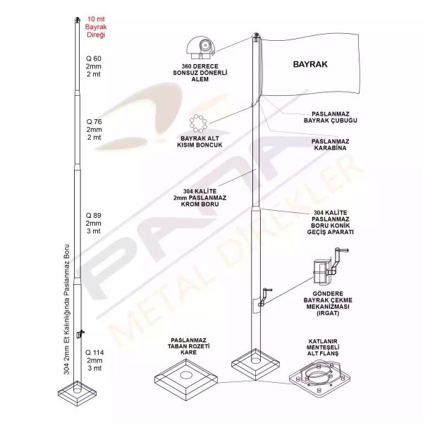 10 metre standart bayrak direği ürünümüzde 360°Sonsuz Döner Tepe, Bayrak Boncuğu, İp Sarma Mekanizması(Irgat,Patentli Ürün), Taban Rozeti(Kare), Menteşeli Flanş ve Ankaraj Malzemeleri bulunmaktadır. Bayrak ürüne dahil değildir.