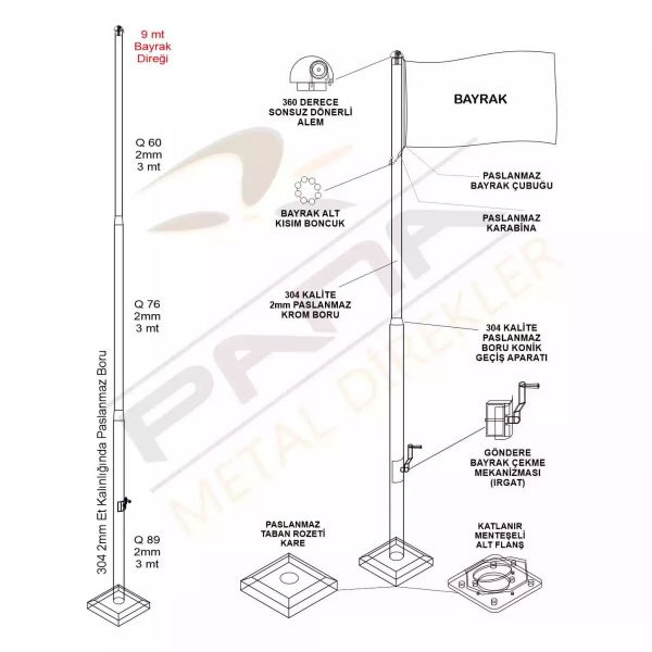 9 metre standart bayrak direği ürünümüzde 360°Sonsuz Döner Tepe, Bayrak Boncuğu, İp Sarma Mekanizması(Irgat,Patentli Ürün), Taban Rozeti(Kare), Menteşeli Flanş ve Ankaraj Malzemeleri bulunmaktadır. Bayrak ürüne dahil değildir.