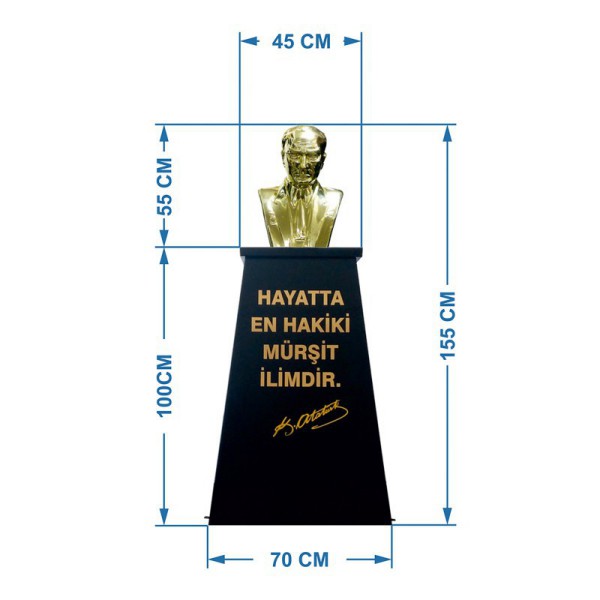 Atatürk Büstü kaidesi olarak imal ettiğimiz bu modelin çift taraflı paslanmaz galvaniz sac üzerine elektrostatik fırın boya yapılmıştır . Alt kısmında yere montajıda yapılabilen hazır kaide modelinin, üzerindeki yazı gold renginde folyo harf den istenilen metin yazılacaktır. Üst kısımdaki Atatürk Büstü 100 cm yüksekliğinde profesyonel modeldir.
