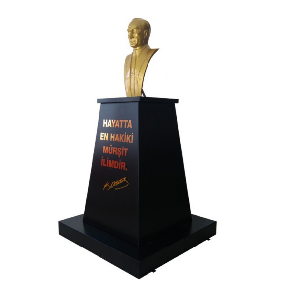 Atatürk Büstü kaidesi olarak imal ettiğimiz bu modelin çift taraflı paslanmaz galvaniz sac üzerine elektrostatik fırın boya yapılmıştır . Alt kısmında yere montajıda yapılabilen hazır kaide modelinin, üzerindeki yazı gold renginde folyo harf den istenilen metin yazılacaktır. Üst kısımdaki Atatürk Büstü 70 cm yüksekliğinde profesyonel modeldir.