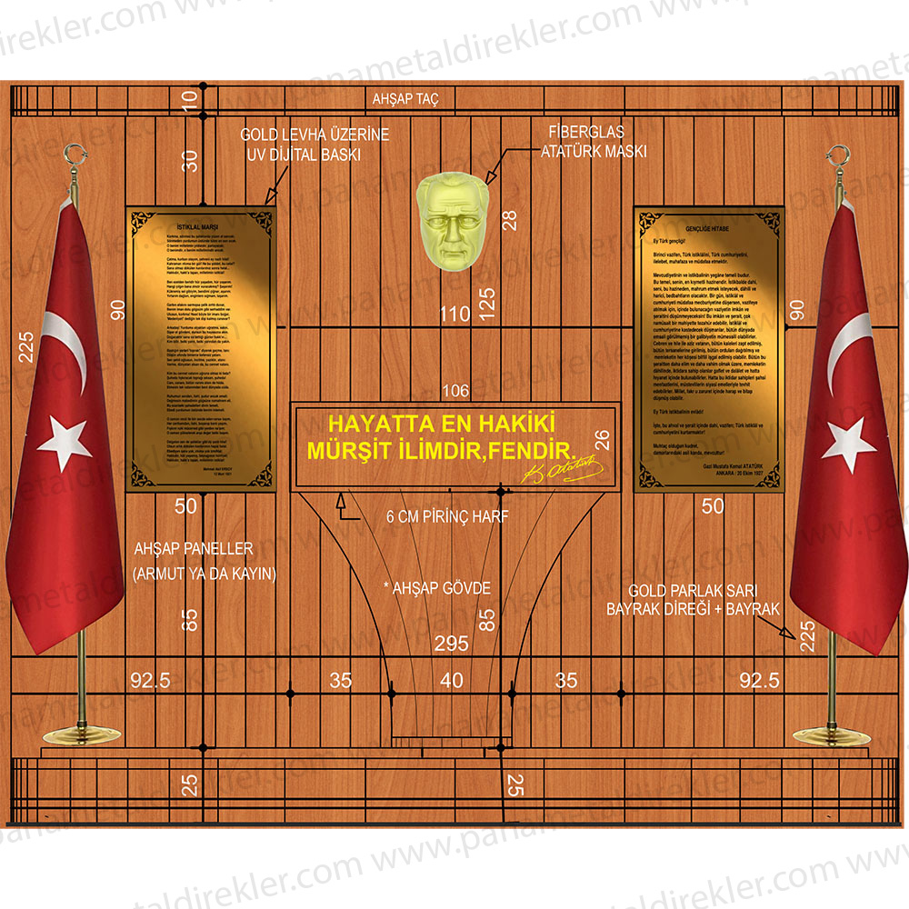 İstenilen özelliklere sahip Atatürk köşesi ürünleri, okullar, kamu kurumları, belediyeler, özel kuruluşlar ve ofislerde Atatürk’ü ve onun ilke ve inkılaplarını yaşatmak amacıyla kullanılmaktadır. İstiklal Marşı ve Gençliğe Hitabe levhaları, Atatürk’ün vizyonunu yansıtan vecizeleri ve maskı ile tamamlanan bu köşe, hem estetik hem de anlam derinliği taşıyan bir alan sunar. Paslanmaz gold levha üzerine UV baskı teknolojisi ile üretilen bu ürünler, uzun ömürlü ve dayanıklıdır. Bayrak direği ve bayrak setiyle birlikte tam bir takım olarak, özenle paketlenmiş bir şekilde sevk edilir.