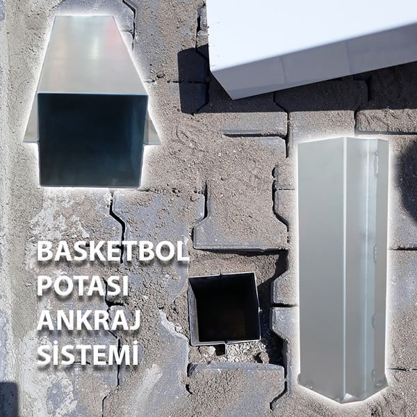 Basketbol potası direği 120 x 120 x 3 mm kalınlığındaki kutu profilden imal edilir. Bomun panya bağlantısında kullanılan 18 cm x 26 cm x 8 mm saca Q 30 mm lik menteşe kaynatılarak panyanın ön ve arkaya sıfır hatayla bağlantısı sağlanır. Bom şekli ekte verilen teknik çizimde belirtildiği gibidir. Basketbol potası panyası 105 cm x 180 cm x 10 mm kalınlığındaki temperli camdan imal edilmiştir. Kullanılan camda, cam ile çember bağlantısının oluştuğu noktanın bağlantı noktası şeklinde oyuk olması gerekir. Çembere yapılan baskıyı camdan ayırmak için böyle bir uygulama yapılmalıdır. Cam üzerinde bulunan çizgiler kumlama işleminden sonra emaye boya ile temperlenir (fırınlanır). Panya direncini arttırmak amacıyla 30 x 50 x 3 mm profilden çerçeve yapılmıştır. Çerçeve ile cam arasına silikon sıkılarak, cam koruma çerçevesi ile sabitlenir. Panyanın yüksekliğini sıfır hatayla yerine getirebilmek amacıyla cam panya omron kızak sistemi ile + – 5 cm lik hatayı engelleyebilecek hale getirilir. Cam panya ile çember bağlantısı özel bükülmüş plaka yardımı ile yapılır. Çember yüksekliğinin ayarlanması için plaka üzerinde omrondelik sistemi kullanılmıştır. Çemberin yere olan yüksekliği 305 cm olacaktır. Basketbol potası çemberi 3 mm kalınlığında Q 22 boru bükülerek iç çapı Q 45 cm gelecek şekilde imal edilir. Ölçüler uluslar arası normlara uygundur. Çember ağ bağlantısı 12 noktadan yapılacaktır. Ağ, çembere ağ bağlama kancalarına geçirilen çelik halat yardımı ile bağlantı yapılır. Kullanılan ağ sekiz sıra, seksen dört düğümden oluşan üç renkli floş ağ olacaktır. Tüm aksam elektrostatik boya ile boyanır. Kullanılan boyanın kalınlığı min.120 micron olacaktır. Kullanılan ankaraj malzemesi 50 cm boyunda olmalıdır. Ankaraj uygulaması yapılacak yüzey karot yardımı ile hatasız şekilde delinir. Ankaraj, hazırlanan bölmeye yerleştirilir ve teraziye alınır. Teraziye alma işleminden sonra ankaraj sabitlenir. Ankaraj sabitleştirme işinde 350 dz. beton malzeme kullanılır. Ankaraj uygulamasından min. 24 saat sonra pota montaj uygulaması yapılır. Uygulama işleminde pota bom kısmının 50 cm’si önceden hazırlanan ankaraj kovanının içine girecek şekilde montaj yapılır.